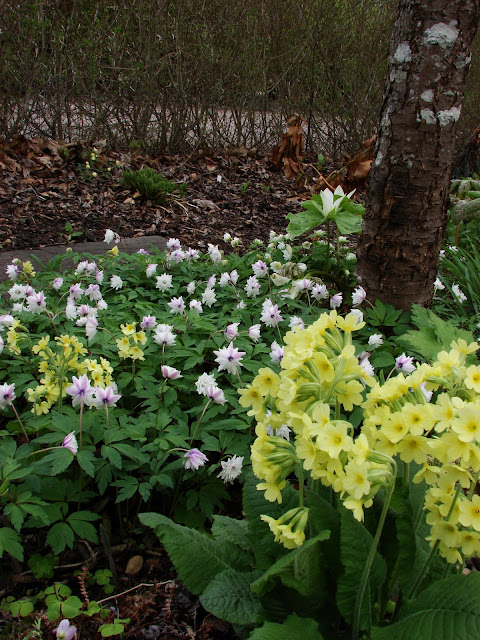 En salig vitbrokig blandning i lunden, i bakgrunden en söt liten Krypflox Phlox stolonifera 'Ariane' och smalbladig Funkia.